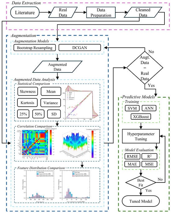 The research methodology was divided into two major components: data augmentation and the development of predictive models. The dataset was extracted from the literature, and after preparation, it was augmented to generate synthetic data. A statistical analysis was performed on the real and the augmented data. The calculated parameters were compared against each other to verify that the augmented data captured the distribution as well as the correlation of the features of the real data adequately. The models were then trained on the augmented dataset and were tested on the real data with their performance evaluated using multiple metrics.