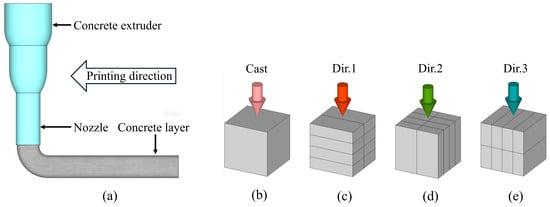 (a) Concrete printing through the extruder, (b) cast compressive strength, (c) printed compressive strength (direction 1), (d) printed compressive strength (direction 2), (e) printed compressive strength (direction 3).