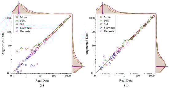 Statistical comparison of the real dataset with (a) BR-augmented data and (b) DGAN-augmented data.
