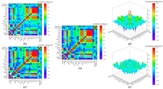 Pearson correlation matrices of the real and DGAN data are also compared to show the effectiveness of the models. It depicts the correlation between features, and it identifies how strongly they are related to each other. This analysis is performed to ensure that the relationship between the different features of data augmented by the BR and DGAN is similar to real data. Figure 6a shows the correlation matrix of the real dataset. The correlation between the HWRA and Cement for the real dataset is −0.030, while for the augmented dataset through DGAN is −0.33 while for data augmented through BR, it is −0.27. Similarly, the correlation between water and print speed is 0.094 for real data, and for the data augmented through the DGAN and BR, it is 0.089 and 0.085, respectively. A similar trend is observed for all other features which is evident from Figure 6b,c. To summarize the comparison between both models, 3D surfaces are generated for the difference in the correlation matrix for real data and augmented datasets. It can be seen from Figure 6d,e that the surface is flatter for DGAN in comparison to BR, showing that the difference between the correlations for DGAN augmented data and real data is less compared to the BR augmented data.