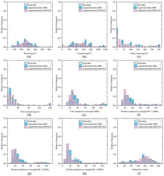 The relative frequency of key features for the data augmented through DGAN and BR and real data is shown in the form of overlapping bar charts with real data represented by light blue, BR augmented data represented by dark blue, DGAN augmented data represented by pink, and the resulting overlap is purple in Figure 7. It also becomes evident from the figure that augmented data matches the distribution of the real data well.