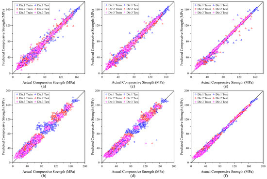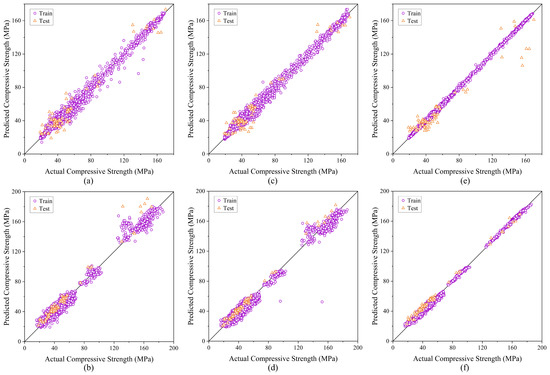 Actual vs. predicted cast compressive strength: (a) DGAN-SVM, (b) BR-SVM, (c) DGAN-ANN, (d) BR-ANN, (e) DGAN-XGBoost, and (f) BR-XGBoost.