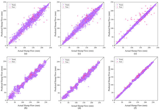 Actual vs. predicted slump flow: (a) DGAN-SVM, (b) BR-SVM, (c) DGAN-ANN, (d) BR-ANN, (e) DGAN-XGBoost, and (f) BR-XGBoost.