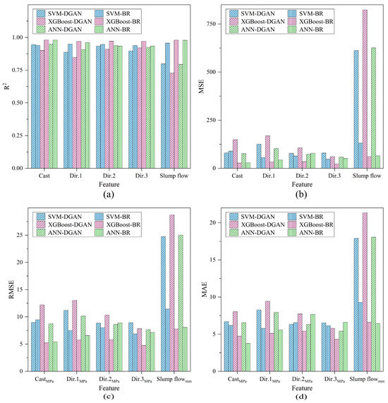 The evaluation metrics for predicting cast strength using different models reveal significant performance differences, as shown in Figure 8. SVM, ANN, and XGBoost models were trained using both BR-augmented and DGAN-augmented data. In terms of R2 scores, which indicate the proportion of variance explained by the model, all models perform exceptionally well during training, with scores close to 1.0. Among these, XGBoost consistently achieved the highest R2 scores, with values of 0.999 for DGAN-augmented data and 0.997 for BR-augmented data, outperforming both SVM and ANN.
