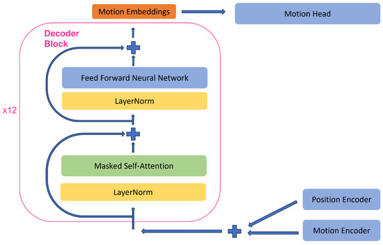 The main idea of these two models consists of using Transformer models due to their superior attention mechanism. Our solutions can be considered akin to ERD [3], because the motion data is encoded into embeddings. which are processed by the model, then translated back to the motion domain by the decoder. However, instead of using an LSTM, we make use of the superior Transformer. This choice is superior because instead of relying on the information stored in the RNN state and its memory, we rely on the model to choose the important motion states from the past when computing the current one. This architecture basically creates a self-learned embedding space in which it is easier to solve the problem at hand. Because we target only next pose generation or de-noising, we employ a decoder-only transformer.