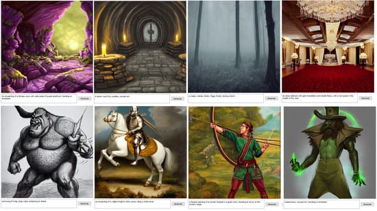 For asset generation Stable Diffusion was used. The basic, text2image [24], generation is handled by StableDiffusionPipeline. This receives as input only the text prompt. Inpainting is done with StableDiffusionInpaintPipieline, the most complex of all, with inputs represented by a text prompt, an image and the inpainting mask. Dreambooth [25] is a standard text2image model, so StableDiffusionPipelines are used for it [26].