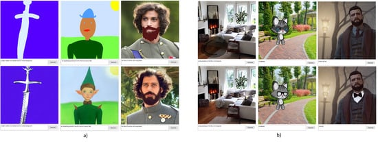 For the asset generation use-case we employ a version of ControlNet trained on user doodles. This provides a powerful model that is capable of turning even the simplest sketches into detailed assets. Moreover, if offers artist the fine-grained control they need for obtaining exactly the assets they want. Since the model was trained on natural, scraped of the internet images, we make use of a salient object detection models, bundled by the rembg (https://github.com/danielgatis/rembg) (accessed on 10 July 2024) package. More specifically, we used -Net [27], a clever pyramid of U-nets [28], where different levels compute the salient regions at different scales. This is run using onnx-runtime. However, the results are not always ideal, with portions of the object missing in some cases. Since the doodles usually represent objects without holes, we used the initial sketch to build an outline mask. We fixed the automatically detected object mask by intersecting it with the filled outline mask. Since this approach is not fail proof or perfect, we used an optional manual mask refinement step to correct the eventual mistakes, which can be integrated seamlessly in an application.