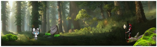 To demonstrate the usefulness of asset generation, we’ve created an extremely simplistic demo game with Pygame. Most assets are created with generative techniques, with the exception of the cat sprite, which we have animated with our CharacterGAN. The assets are generated with our asset generation pipeline, while the background is generated with our background generation pipeline, presented in the previous section. One setting from the game can be observed in Figure 9. While there are problems with blending the assets, especially with the lighting, it looks more than adequate. This result proves that generative techniques are a great tool for artists, because we managed to obtain a good looking result with limited artistic skills and experience in the field. An experienced artist could effortlessly blend the assets in the image using tools like Photoshop to obtain better looking scenes.