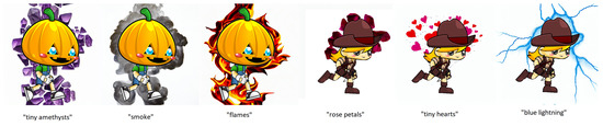 Another use-case is generating effects. Effects can be considered animations of non-object assets, for example the flames of a torch or the lightning effect engulfing a spell. These effects are usually easier to generate because they have different requirements than usual animations. First, they do not represent an actual object. This means that they must have the same style and colours, but do not have to keep the same shape, because the underlying phenomenon they are based on happens really fast. This also means that many frames must be drawn for obtaining convincing effects. Second, they benefit from not being repetitive, because they improve the dynamism. Third, they are more easily ignored.