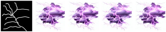 The visual effects pipeline requires two diffusion models, one for generating the initial texture image and one for editing the final effect. We use the same version of diffusion model, StableDiffusion-v1-5 (https://huggingface.co/runwayml/stable-diffusion-v1-5) (accessed on 10 July 2024), for both, but with different pipelines. For texture generation we used the usual text2image pipeline, but for the editing we use an image2image approach. Generating effects cannot be done without any of the two parts of the pipeline. Generating the starting image is crucial for consistency, otherwise the results would be unacceptably different. The image2image process is crucial for result quality, otherwise the effect would be just a cutout from an image, which is not desirable. It must also be noted that our approach is based on the StableDiffusion property that white regions are kept white as well as possible, so instead of generating a full picture through image2image, the model stylises only the content part. We use the same seed for the image2image part for consistency.