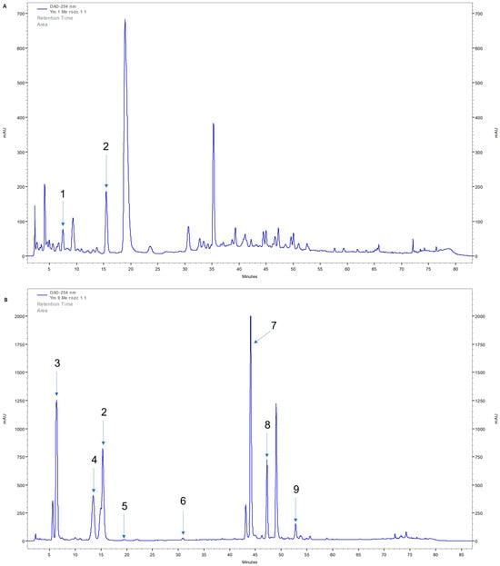 A representative chromatogram of the analyzed Ilex paraguariensis product samples: (A)—the methanol extract from sample P-1 (1—protocatechuic acid, 2—caffeine); (B)—the methanol extract from sample P-9 (2—caffeine, 3—neochlorogenic acid, 4—chlorogenic acid, 5—caffeic acid, 6—4-feruloylquinic acid, 7—isochlorogenic acid, 8—rutoside, 9—astragalin).