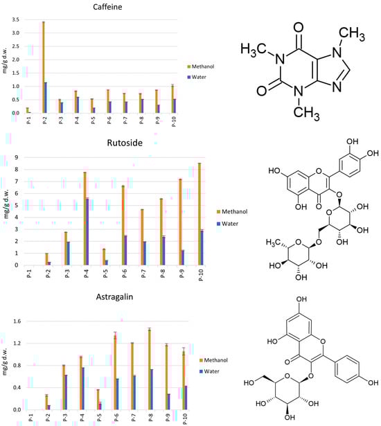 Additionally, the concentration of the following compounds was analyzed: caffeine, rutoside, and astragalin. The content of these compounds in P-1–P-10 products is presented in Table 5. The differences in the content of the tested compounds in ethanol and water extracts are additionally illustrated in Figure 3. Yerba mate is perceived as an energizing or relaxing drink, the consumption of which is similar to tea and infusions; yet there is limited awareness about its antioxidant properties [48]. Caffeine plays a pivotal role in conferring stimulant properties; therefore, the caffeine content was also determined. The content of this purine alkaloid ranges from 0.0278 to 1.1399 mg/g d.w. in water extracts and from 0.1963 to 3.4059 mg/g d.w. in methanol extracts. In a typical 150 mL serving of yerba mate infusion, the caffeine content is approximately 78 mg, which is quite similar to the caffeine found in coffee (around 85 mg). However, it is important to note that during traditional yerba mate preparation, the beverage volume can occasionally extend to 500 mL, leading to an estimated caffeine content of 260 mg or more [8].