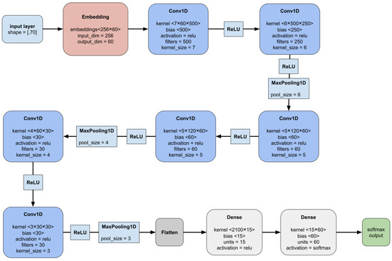 The proposed deep learning model, a fundamental part of the proposed computational scheme, is based on CNN and natural language-processing techniques, with its data input into a character-level embedding layer [12,28]. This receives an initial vector composed of 70 ASCII values relative to each character in the domain to be classified. The embedding layer then converts each value into a vector of 60 values, related to the context of that character in the domain name in question. The output of the embedding layer is then connected to a CNN structure that seeks to extract meta-features relevant to domain name classification from the 70 vectors of 60 values provided by the next higher layer. This CNN structure has six convolutional layers, in addition to relu and maxpooling layers. The output of the CNN structure is then connected to a flattened layer to adjust the shape of the data and then deliver it to a dense classifier. The last dense layer of the classification has a number of neurons equal to the number of classes for which the model is being trained and uses softmax as an activation function. This function assigns a floating point value to each output neuron, and the sum of these values will always be equal to 1 and the highest observed value represents the class to which the model classified the input example. Figure 1 presents a conceptual model of the proposed classifier model; the model itself is available in full in the Kaggle Notebook mentioned in Section 1.