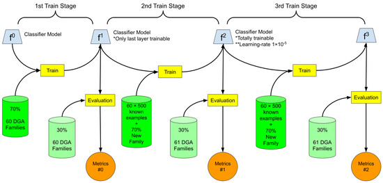 In the proposed methodology, stage f0 represents the classifier model before initial training. Stage f1 therefore represents the classifier model already trained to classify among 60 DGA families. In stage f2, the model has been trained incrementally, with 500 examples of each of the 60 families known by the model that were correctly classified added to 70% of the examples of the new family. At this stage, only the last layer of the model is trainable; all other layers are defined as non-trainable, and this is the first stage of incremental training. In stage f3, the classifier model was trained again, with all layers defined as trainable and a learning rate 10 times lower, to smoothly update the parameters of all layers. At all stages after each training, the metrics were checked to verify the effectiveness of the proposed methodology. The results obtained in the proposed class increment process performed with three different families are presented in Section 3.
