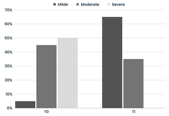 The mMASI was evaluated at the baseline (T0) and at the end of treatment sessions (T1) (Figure 1). At T0, only one subject exhibited mild mMASI, maintaining this status until the end of the treatment (T1). Among the nine subjects initially classified with moderate MASI at T0, a significant 88.9% transitioned to mild mMASI at T1. Similarly, of the ten subjects with severe mMASI at T0, 40% progressed to mild mMASI (Figure 2), while 60% transitioned to moderate mMASI at T1. Remarkably, 10% of subjects showed no change in mMASI, while 90% of subjects demonstrated improvement.