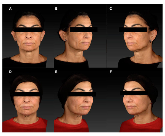 VECTRA® pictures of a patient with severe mMASI at T0 who progressed to mild mMASI at T1. Frontal, right lateral 37°, and left lateral 37° views at baseline (A–C); frontal, right lateral 37°, and left lateral 37° views after five sessions of treatment (4 months) (D–F).