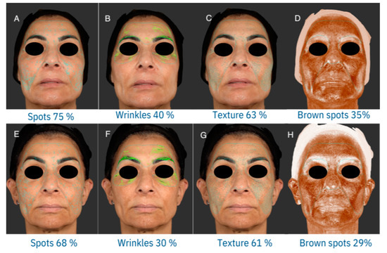 VECTRA evaluation of skin parameters (spots, wrinkles, texture and brown spots) at T0 (A–D) and T1 (E–H): A reduction in the percentage values related to all four analyzed parameters emerges; in particular, a significant improvement in spots and brown spots is observed.