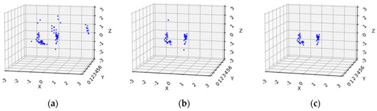 As shown in Figure 2a, Figure 2b and Figure 2c, respectively, represents the original point cloud, the point cloud after pass-through and statistical filtering, and the final point cloud after inter-frame difference filtering. The inter-frame difference filtering method effectively eliminates the noise caused by multipath interference and noise that exceeds the normal range of human action.