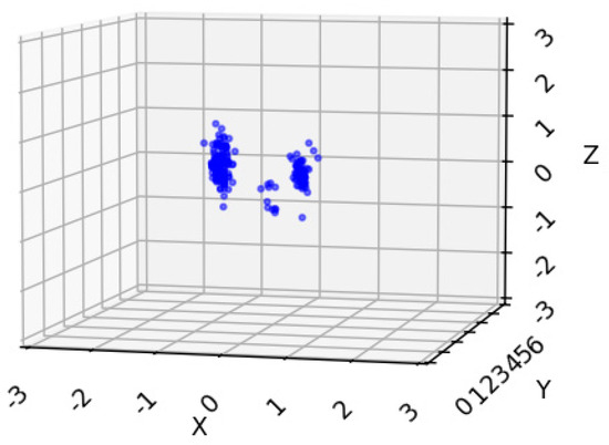 Because most human actions occur within 1–3 s, to completely cover the entire human action cycle in this paper, we set the acquisition period of action as 4 s, and the millimeter-wave radar collects 15 frames of point cloud data per second. In our experiments, we found that the number of superimposed frames needs to be more significant to overcome the sparsity of millimeter-wave radar, and the number of superimposed frames is too large to lose a large number of spatial and temporal features. Because each action has 60 frames of data in a 4 s acquisition period, to ensure that the data can be evenly distributed, we need to ensure that the number of superimposed frames can be divided by 60. Ultimately, we choose to aggregate six frames of point cloud data into one frame of point cloud data to generate a more dense point cloud of the human body, as shown in Figure 3. After aggregation, a single action will generate 10 aggregated point clouds so that the entire human body action can be accurately depicted without significantly losing information due to the small number of frames. Since the variations in human actions in most daily activities are mainly manifested in the variations in human height (e.g., standing, bowing, sitting, squatting, etc.) and the variations in human limbs (e.g., boxing, kicking, etc.), these human actions can be accurately described in both the x-axis and z-axis dimensions. Thus, we round off the y-axis component to obtain the point cloud projection in the xz plane, as shown in Figure 4. This approach retains most of the critical information and dramatically reduces the amount of data.