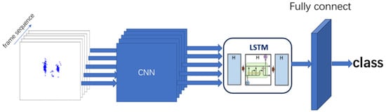 Human action is a continuous process that contains both spatial and temporal features. CNNs have achieved remarkable success in image recognition, target detection, and face recognition and have subsequently been widely used in gesture, action, and gait recognition in millimeter-wave point clouds. The LSTM network, through the designed structure of memory cells, input, forgetting, and output gates, effectively solves the traditional problem of long-term dependency in RNNs [26]. The memory unit allows for the network to store and maintain information in long sequences. In contrast, the gating mechanism allows for the network to selectively read, write, and forget information to capture long-term contextual relationships better. The traditional RNNs are prone to the problem of gradient vanishing or gradient explosion when dealing with long sequences, making it challenging to learn long-term dependencies efficiently [27]. LSTMs help alleviate these problems through gating mechanisms, especially forgetting gates, making the network more stable during training; the CNN + LSTM framework is used in this paper. Firstly, spatial feature extraction is performed separately for each frame after aggregation by the CNN, and then the extracted features are fed into the LSTM network in frame order (chronological order), as shown in Figure 5. The LSTM network captures the patterns and relationships in the time series. The LSTM network outputs are connected to form a complete feature representation. Finally, the classification of actions is outputted through a fully connected layer. The advantage of this structure is that each CNN branch focuses on a one-time frame, which helps to extract the spatial information of that time frame. The LSTM network integrates the information from these time frames and models the temporal relationships [28]. This approach allows for the better handling of time series data and reduces the model’s over-reliance on the entire sequence.
