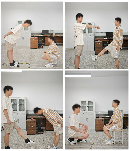 The radar board’s power connector is powered up at startup and the data exchange interface is connected to the PC. In the configuration area, the distance resolution is set to 4.0 cm, the maximum detection range is 9 m, the maximum measurable radial velocity is 1.5 m/s, the radial velocity resolution is 0.13 m/s, and 15 data frames are collected per second. The radar height is set to 0.8 m, the distance between the experimenter and the radar is set to 4 m, and the distance between the two experimenters is set to 0.5 m, which is usually considered the average social distance. The experiment recorded the following five actions (punching, kicking, bowing, going from standing to crouching, and going from sitting to standing, as shown in Figure 7). Nine volunteers ranged from 155 cm to 185 cm in height and from 42 kg to 91 kg in weight. These volunteers are grouped in pairs and performed different actions facing the radar at an average period of 4 s. Eventually, 21,600 data frames are measured for each action, and 108,000 frames are captured for the five actions. Stacking 6 frames gave 3600 point cloud images for each action and 18,000 point cloud images for the 5 actions.