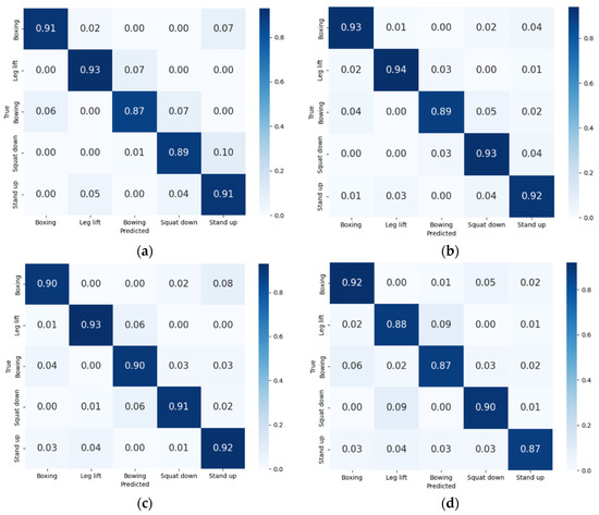 Confusion matrix of human body and radar at different distances: (a) 2 m from radar (b) 4 m from radar; (c) 6 m from radar; and (d) 8 m from radar.