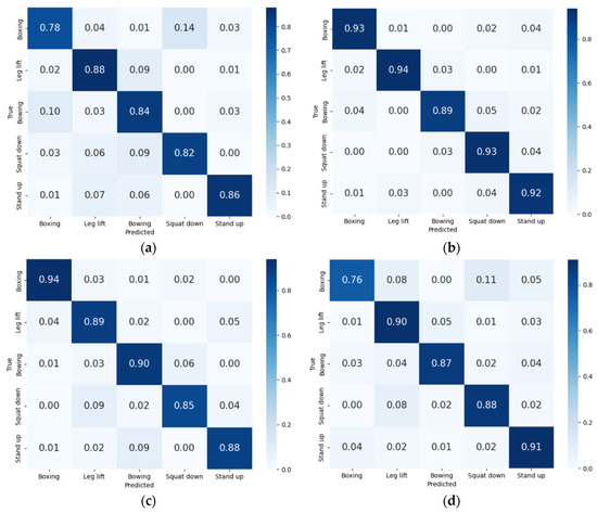 Confusion matrix for different radar placement heights. (a) Radar height: 0.4 m. (b) Radar height: 0.8 m. (c) Radar height: 1.2 m. (d) Radar height: 1.6 m.