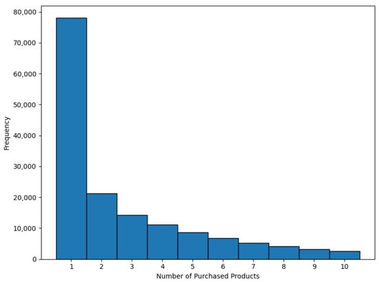 The real-world dataset was collected from Katcher’s, a Korean e-commerce platform, over the period from April to July 2023. During this time, a total of 101,644 orders were recorded, out of which 23,564 orders (approximately 23%) involved concurrent purchases, as illustrated in Figure 1. The dataset includes 1727 unique products across 555 different categories. The data used in this experiment cover a diverse range of products, and the geographical region is limited to South Korea.