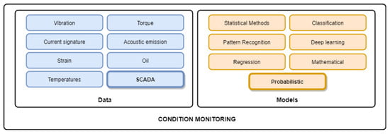 As a summary and to support the final motivation and justification for the selection of the proposed methodology, Figure 1 and Table 1 are shown. Figure 1 illustrates the typical data used in condition monitoring, as well as the most commonly employed models. It highlights the scope of this paper, which focuses on SCADA data and probabilistic models. Table 1 presents a representative selection of the prevailing trends and dominant models in fault detection and diagnostics within wind turbine components, based on SCADA data, with applications in condition-based maintenance. SCADA data may be a preferable choice for condition monitoring, over well-tested techniques like vibration-based, due to its availability and low cost of exploitation, providing a comprehensive view of equipment performance. Leveraging existing infrastructure, SCADA enables effective anomaly detection and predictive maintenance, enhancing operational efficiency and minimizing downtime.