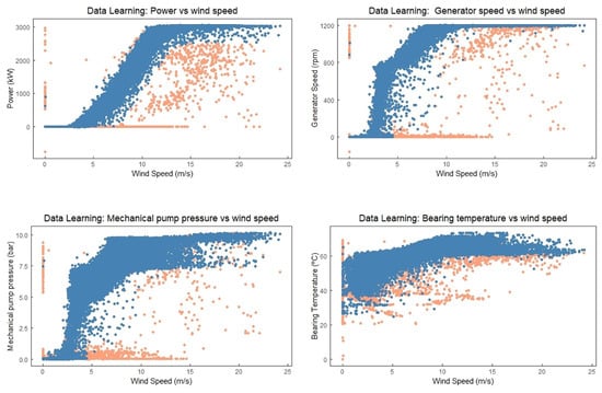 The results of the applied methodology are shown in Figure 3 where power, mechanical pump pressure, bearing temperature and generator speed are plotted against wind speed. It can be seen how the main outliers are identified and removed from the set of learning data. The filtering methodology outlined above has been carried out on all the analyzed wind turbines.