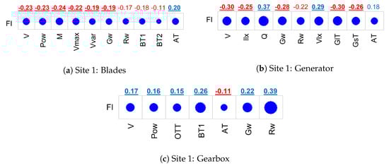 Hereafter, the findings obtained from the Spearman correlation of FI and the dependent variables are shown in Figure 4 and Figure 5. These figures show the most influential variables in the failure index results allowing us to discard some of them to simplify the models. In order to harmonize the number of variables and generate the models considering the most influential of them, they were reduced to 7 to establish the final GMCM model in the learning period. For this purpose, the variables with a Spearman correlation index greater than 0.18 (V, Pow, M, Vmax, Vvar, Gw, AT) were selected in the case of the blade model (see Figure 4a). In the case of the generator model, the selected variables were associated with Spearman index values greater than 0.22 (V, Ilx, Q, Gw, Vlx, GlT, GsT) (see Figure 4b). Finally, a value greater than 0.1 was fixed for variable selection in the gearbox model in site 1 (V, Pow, OTT, BT1, AT, Gw, Rw) and site 2 (V, Gw, Rw, OEP, OMP, OIP, Pow) (see Figure 4c and Figure 5).