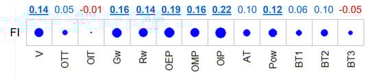 Spearman’s Correlation: FI vs. dependent variables, Site 2: Gearbox (selected variables are underlined). Positive (blue) and negative (red) correlations are shown. Circle size reflects correlation strength.
