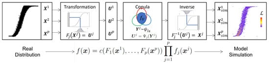 As a summary of the generative process of applying the GMCM Copula, Figure 6 illustrates the transformation of variables in the real domain to the transformed field ([49]) followed by modeling interdependencies among the variables using the GMCM. Subsequently, a simulation is performed in the copula space, and then an inverse transformation, as described previously, is applied to obtain simulated data in the real domain. It highlights the workflow of the GMCM model and how the transformations between the copula domain and real variable domain are integrated, providing a clear visual representation of the key stages of the generative process.