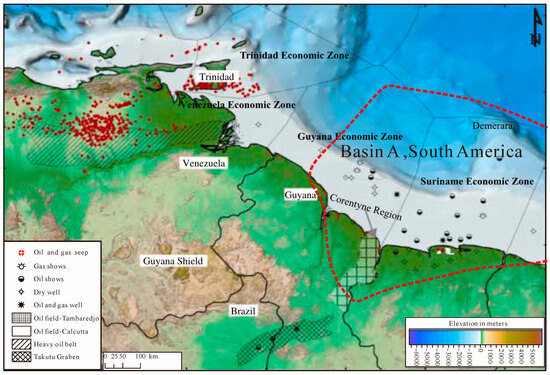 - Hermeston, S.; Torres, M.; Kean, A.; Ramos, D.; Brisson, I. E020 New Exploration in the Proven Petroleum System of the Suriname Offshore Basin, Suriname. In Proceedings of the 67th EAGE Conference & Exhibition, Madrid, Spain, 13–16 June 2005; European Association of Geoscientists & Engineers: Madrid, Spain, 2005. [Google Scholar]