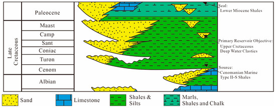 Basin A is a passive continental margin basin formed by the separation of the South American and African plates as a result of the rifting of the Gondwana continent (Figure 1); it mainly experienced two stages of evolution, the Jurassic-Cretaceous to Aptian rift and the passive marginal stage since the Albian, and developed the NW-SE Early Cretaceous high-angle tensile fractures parallel to the shelf, the stratigraphy of the basin is relatively continuous, and mud shale, deep-water turbidite sandstone, carbonate rocks, etc., are well developed (Figure 2) [30].