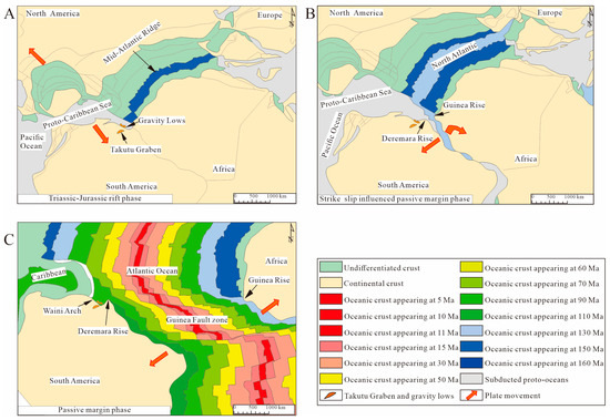 Plate tectonic evolution of Basin A (A) Triassic-Jurassic Rift Phase. (B) Lower Cretaceous Strike Slip Influenced Passive Margin Phase. (C) Upper Cretaceous-Recent Passive Margin Phase.