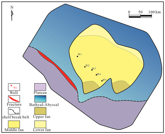 The Late Cretaceous Maastrichtian Formation possesses good physical characteristics, abundant drilling and seismic data, and lacks fracture zones. Through the observation and statistics of the core, it is found that high-angle structural tension fractures develop, and oil and gas are shown in the fractures. Through the examination of the logging data, it is evident that the natural gamma curve displays funnel, bell, low-amplitude micromoth, and box-funnel composite shapes. The sedimentary phases progress from west to east, consisting of the shallow tableland phase, submarine fan phase, and deep-sea in-situ deposition. Within the sedimentary submarine fan phase are three subphases: the upper fan, middle fan, and lower fan subphases (Figure 4). The lithologies consist of sandstone and siltstone, including silt, sandy siltstone, sandy marl, marl, mudstone, and sandy mudstone.