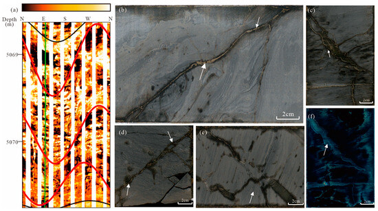 452 structural fractures were measured and collected in five logging cores in Basin A. The characteristics of these fractures indicate that they are mainly high-angle tension fractures formed under the action of a tectonic stress field [33] (Figure 5). Usually, tensile fractures are characterised by high-angle fractures in the core, which are curved, have short extension distances, and are unstable (Figure 5e) [34,35]. The edges of the fractures show jagged edges, and the fracture surfaces are rough and uneven without scratch. Fracture grouping is not apparent, with a certain degree of openness, but is often half-filled by minerals such as square zeolite and calcite (Figure 5b). Tension fractures sometimes constitute serrated tracking tension joints, monoclinic or conjugate geese-row tension joints, etc. Observations of the fractures in the core in Basin A revealed that they have dendritic bifurcation (Figure 5c). Its small nodules are not oriented; amygdaloidal and amygdaloidal nodules are elliptical, with inconspicuous rhombic angles (Figure 5d). Fluorescent reflections are observed in all fractures (Figure 5f), proving it has oil and gas filling.