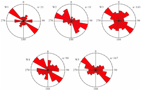 Fracture statistics from the drilling imaging logs in Basin A indicate that high-angle tension fractures dominate natural fractures (Figure 5a). The fracture tendency of the W1 well is mainly NEE and NNW, the dip angle 40~80° is dominant, and the fracture strike is NWW-SEE dominant, 120~140°. The fracture tendency of the W2 well is SEE dominant, 100~120°. The fracture tendency of the W3 well is SNE dominant, 120~140° dominant. The fracture tendency of the W4 well is SEE dominant, 120~140° dominant. The fracture tendency of the W5 well is mainly NNE, the fracture strike is NWW-SEE, the fracture strike is mainly 120~140°, and the dip angle is mainly 50~60°. The dominant fractures are distributed primarily in the direction of NNW~SSE (Figure 6).