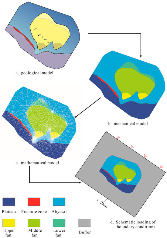 The geometry of the initial model is based on the sedimentary phase plan and tectonic map. The mechanical data of the rocks in different sedimentary phases are calculated and counted, and the parameters are projected according to the type of sedimentary phase to differentiate the values of the petrophysical parameters of the different kinds of sedimentary phases. Secondly, the average values of petrophysical parameters of different sedimentary phases are obtained according to the projection map. Finally, the phase types are simplified into three modules: shelf slope folding zone, abyssal, and sedimentary fan, combined with the tectonic map (Figure 7a). The average values of the parameters obtained are assigned to these three modules. Then, according to the actual geological condition of the stratum in Basin A, the model is divided into finite element modelling.
