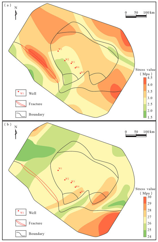 Numerical simulation results of paleotectonic stress field ((a) Maximum principal stress of Maastrichtian Formation; (b) Minimum principal stress of Maastrichtian Formation). W1–W5 (well name).