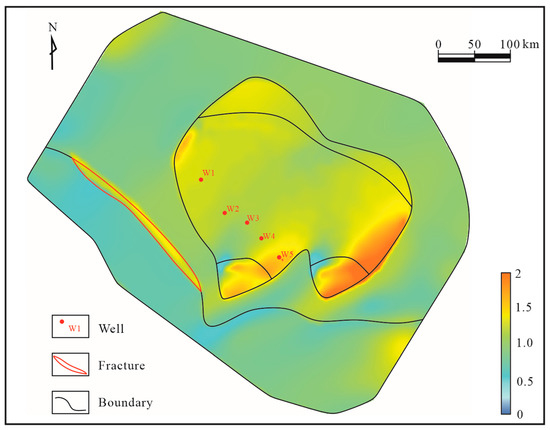 In general, structural fractures are more likely to be accompanied by fracturing and folding activity [44]; this paper mainly applies the rupture coefficient of structural fractures to study structural fracture development and distribution law.
