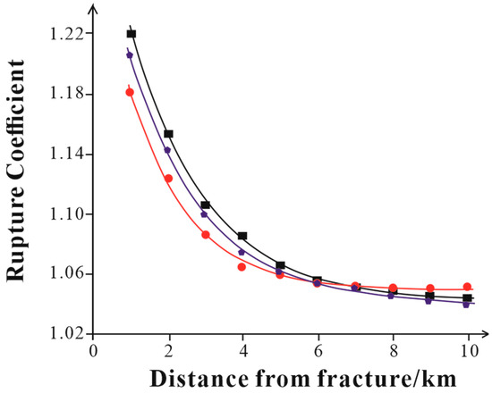 According to the graph of rupture coefficient versus distance from the fracture zone (Figure 10), it can be seen that the rupture coefficient decreases exponentially with the increase in distance from the fracture zone; the equations of the exponential curves obtained from the fitting are respectively y = 0.28771e(−x/0.197525) + 1.0316, y = 0.29338e(−x/0.202231) + 1.04179, y = 0.25033e(−x/0.157353) + 1.04877, where y represents the rupture coefficient and x represents the distance from the fracture zone.