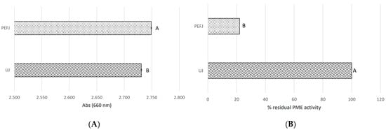 Cloud values (A) and pectinmethylesterase activity (B) in UJ (untreated juice) and PEFJ (PEF-treated juice) immediately after the process (T0). Data are expressed as means of three analytical replicates ± standard errors. Means significant differences are expressed by different letters: p ≤ 0.01; n = 3.