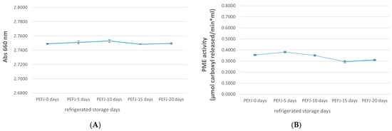 Cloud values (A) and pectinmethylesterase activity (B) in PEFJ (PEF-treated juice) during further refrigerated storage at 4 °C. Data are expressed as means of three analytical replicates ± standard errors; n = 3.