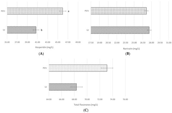 Hesperidin (A), narirutin (B), and total flavanone content (C) in UJ (untreated juice) and PEFJ (PEF-treated juice) immediately after the process (T0). Data are expressed as means of three analytical replicates ± standard errors. Means significant differences are expressed by different letters: p ≤ 0.05; n = 3.