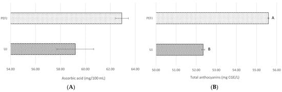 Ascorbic acid (A) and total anthocyanin (B) contents in UJ (untreated juice) and PEJ (PEF-treated juice) immediately after the process (T0). Data are expressed as means of three analytical replicates ± standard errors. Means significant differences are expressed by different letters: p ≤ 0.01; n = 3.