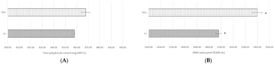 Total polyphenol content (A) and ORAC units (B) in UJ (untreated juice) and PEFJ (PEF-treated juice) immediately after the process (T0). Data are expressed as means of three analytical replicates ± standard errors. Means’ significant differences are expressed by different letters: p ≤ 0.05; n = 3. * GAE: Gallic acid equivalents.