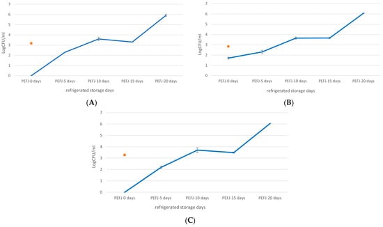 Mesophilic viable bacterium (A), yeast and mold (B), and orange juice spoilage microorganism (C) growths in PEFJ (PEF-treated juice) during refrigerated storage (4 °C). Red dots in each graph indicate the initial microbial load in UJ (untreated juice). Data are expressed as means of three analytical replicates ± standard errors.