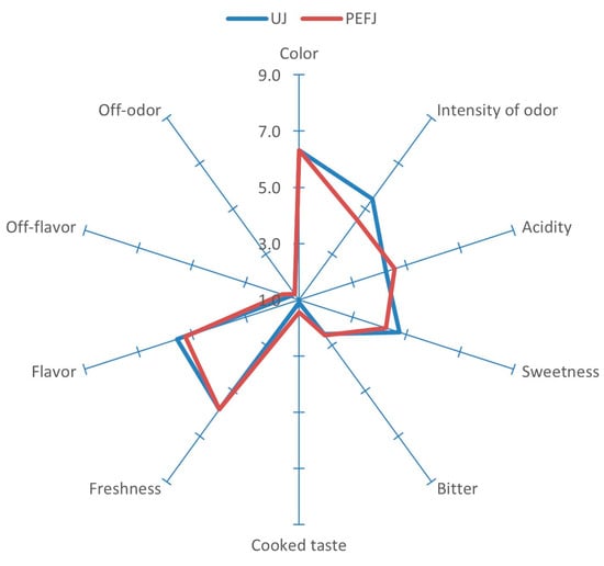 Sensory evaluation in UJ (untreated juice) and PEFJ (PEF-treated juice) immediately after the process (T0). Data are expressed as means of three analytical replicates.
